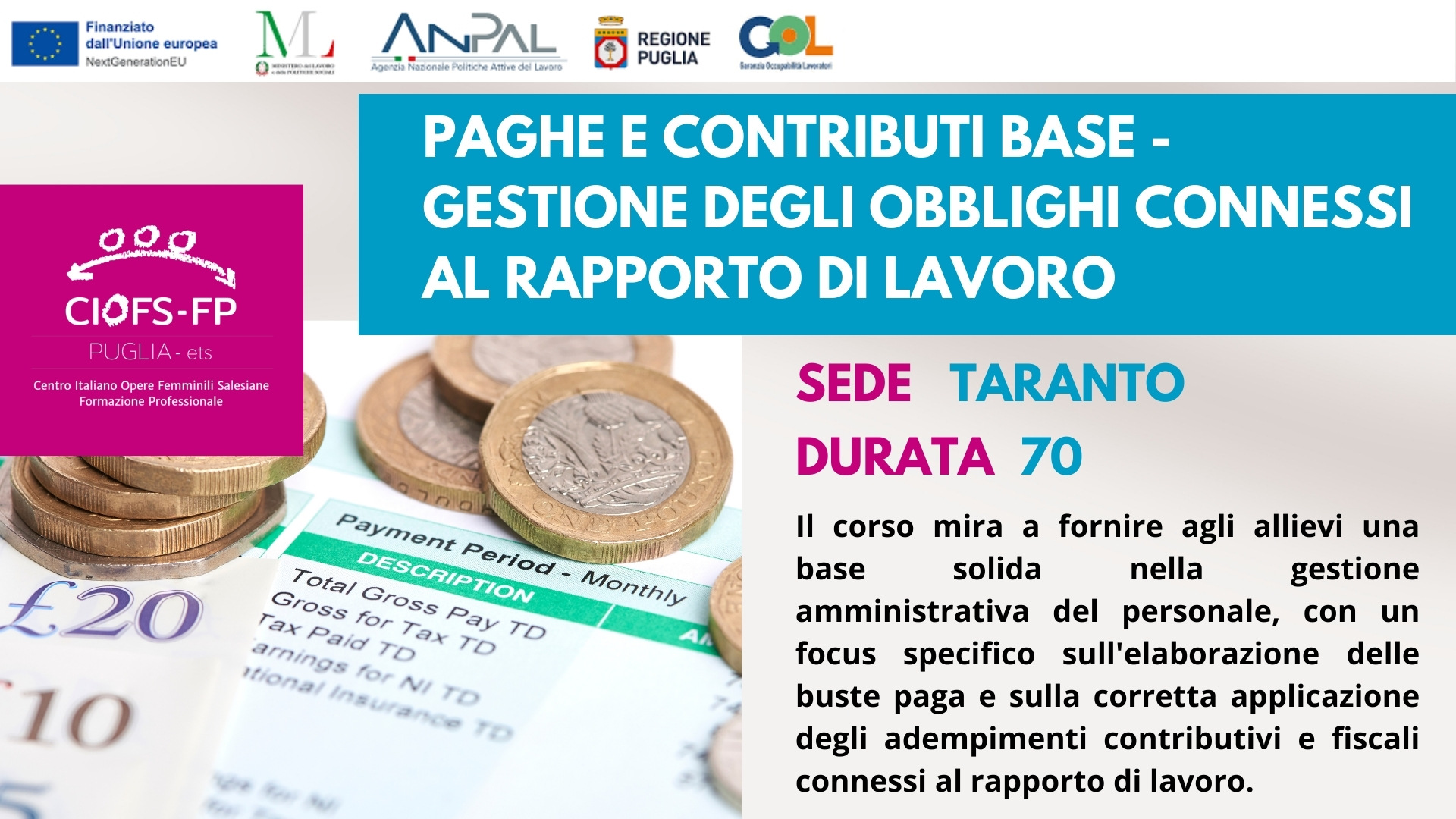 Il corso mira a fornire agli allievi una base solida nella gestione amministrativa del personale, con un focus specifico sull’elaborazione delle buste paga e sulla corretta applicazione degli adempimenti contributivi e fiscali connessi al rapporto di lavoro. Gli obiettivi principali includono:
